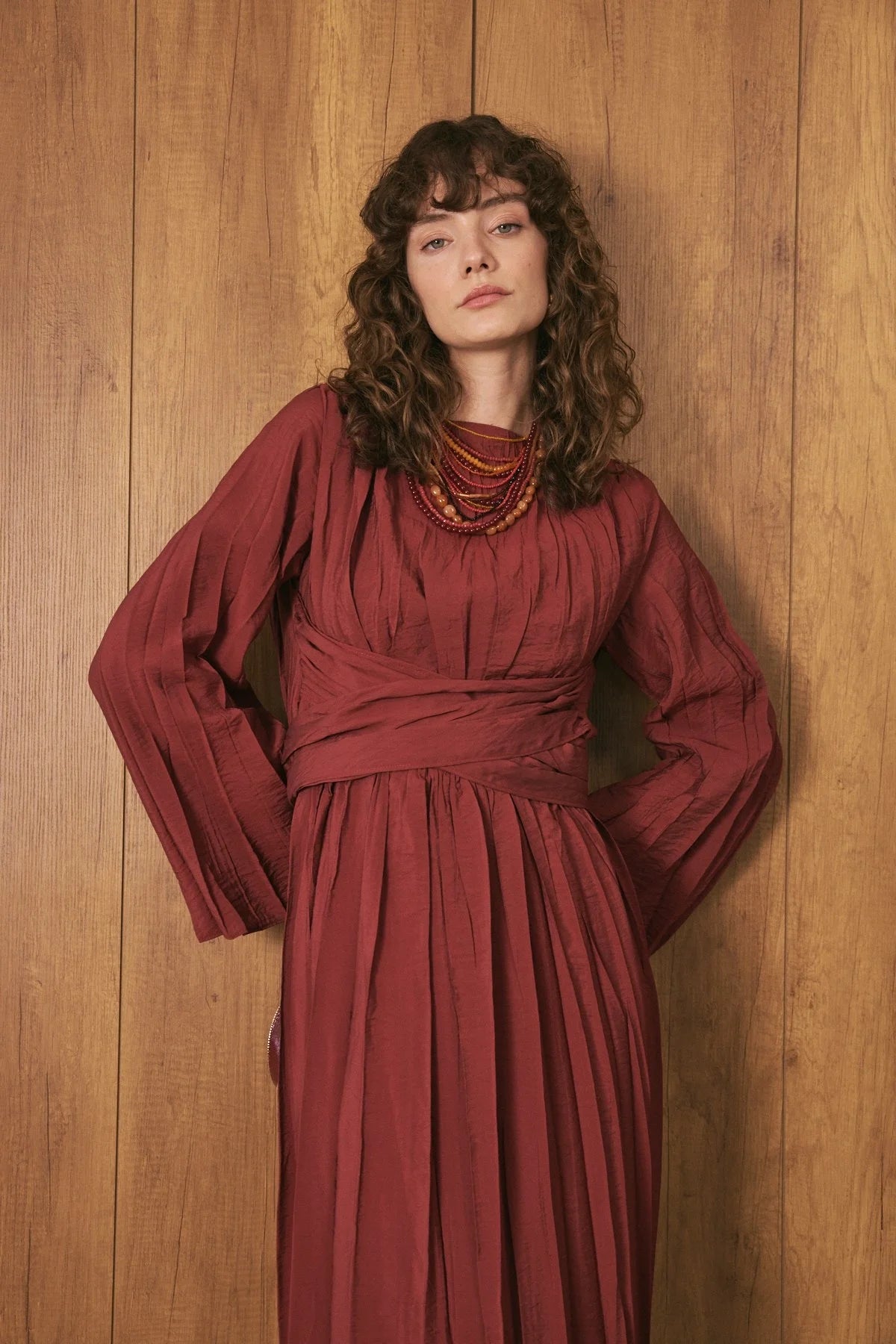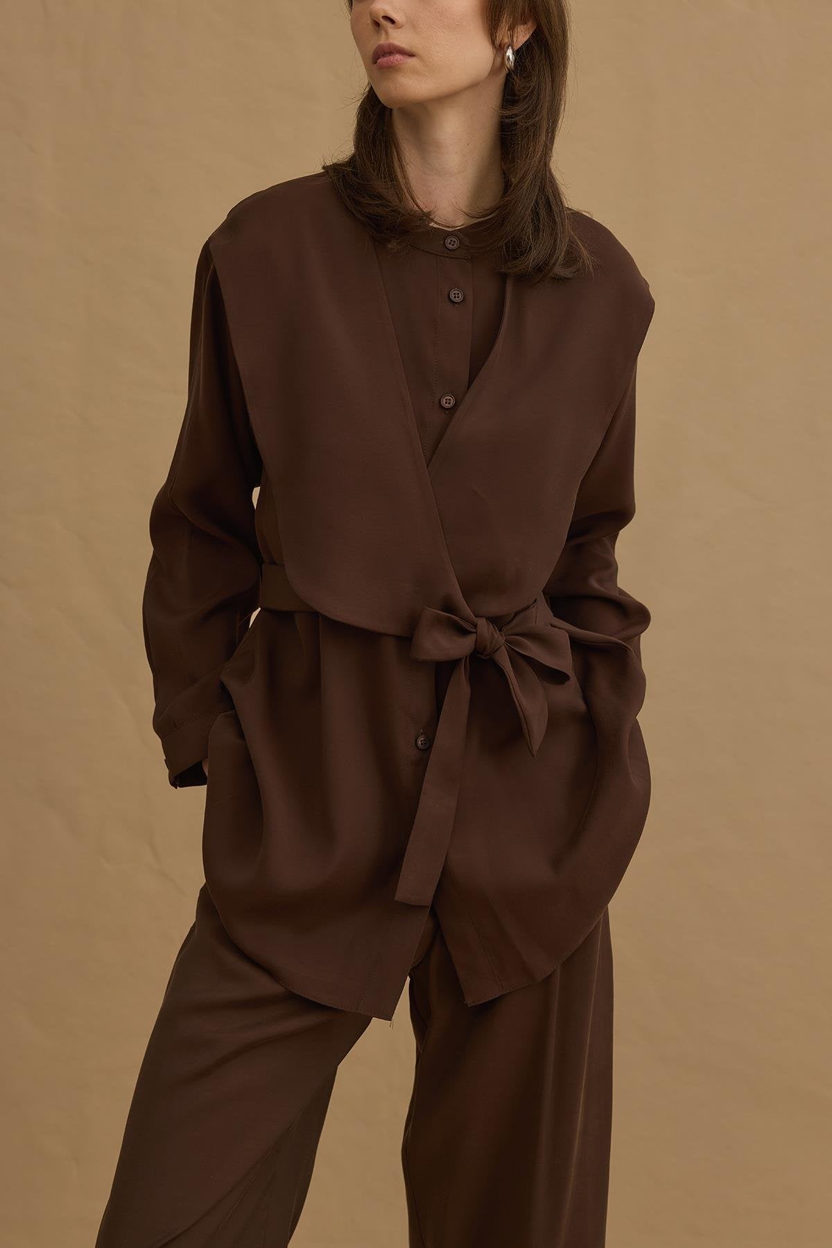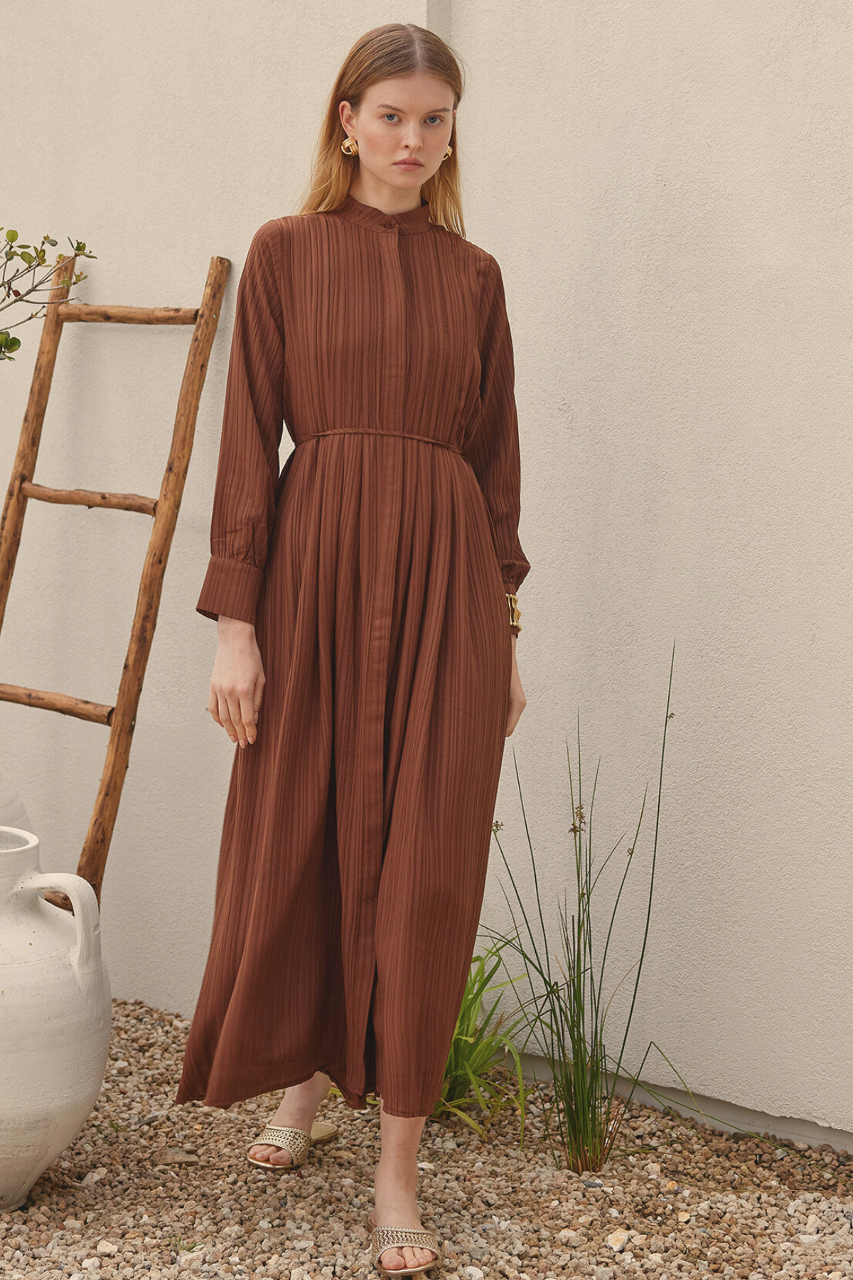Pleated Linen Shirt Dress Brown