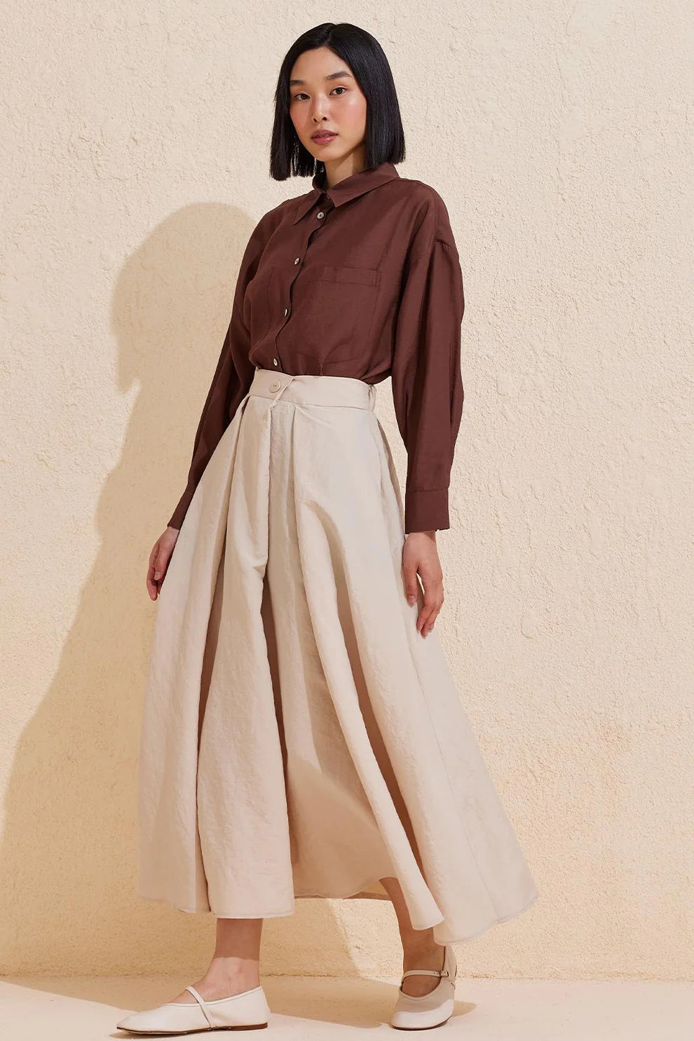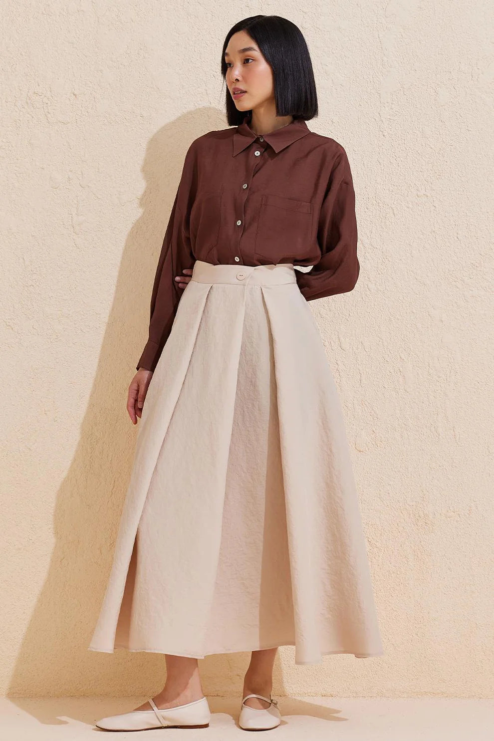 Pleated Flared Long Skirt Stone