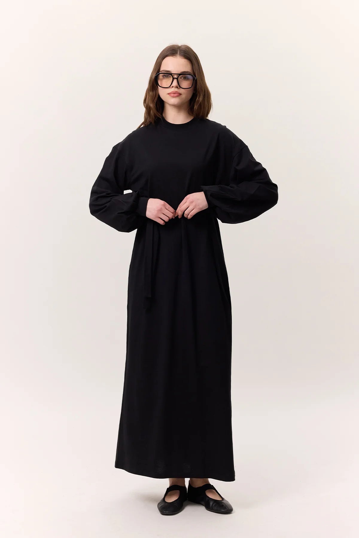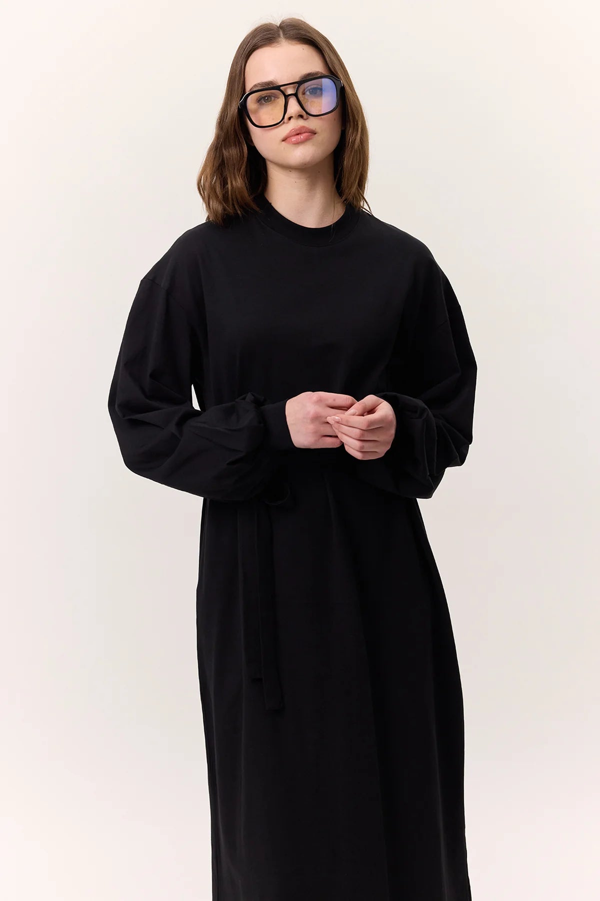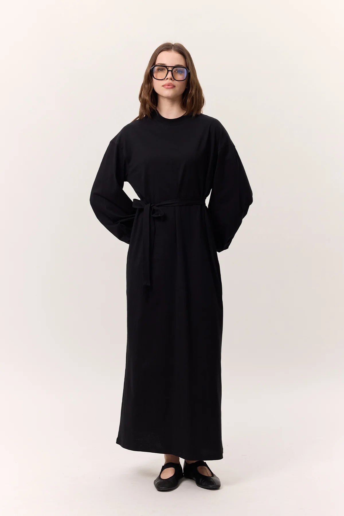 This full-length dress features a classic crew neckline, dropped shoulders, and long sleeves finished with subtle cuffs. It comes with a self-tie belt in the same fabric, allowing for a personalized, flattering fit. Made from 100% cotton, it's lightweight, breathable, and ideal for everyday wear with ease and elegance.