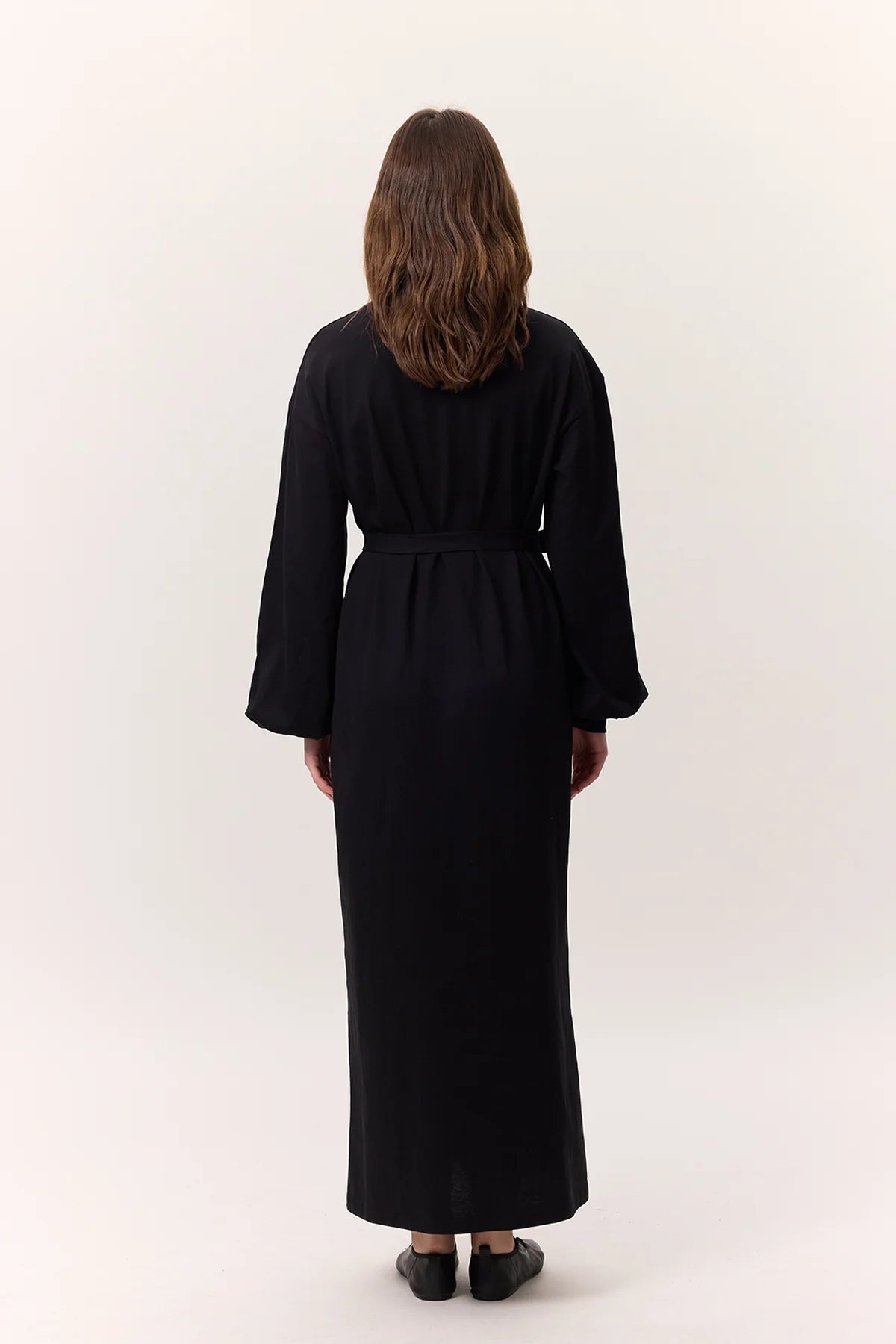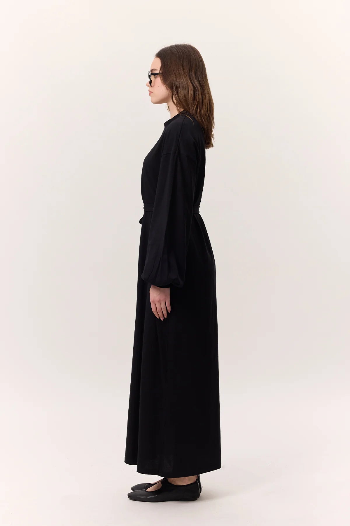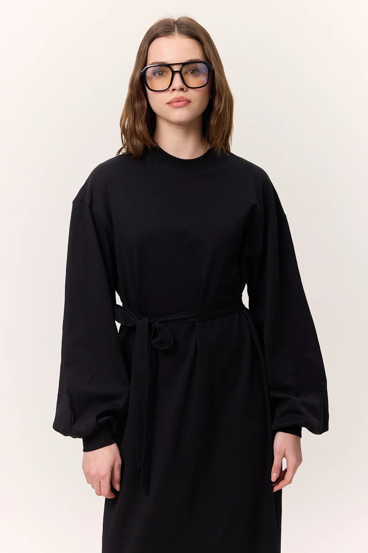 This full-length dress features a classic crew neckline, dropped shoulders, and long sleeves finished with subtle cuffs. It comes with a self-tie belt in the same fabric, allowing for a personalized, flattering fit. Made from 100% cotton, it's lightweight, breathable, and ideal for everyday wear with ease and elegance.