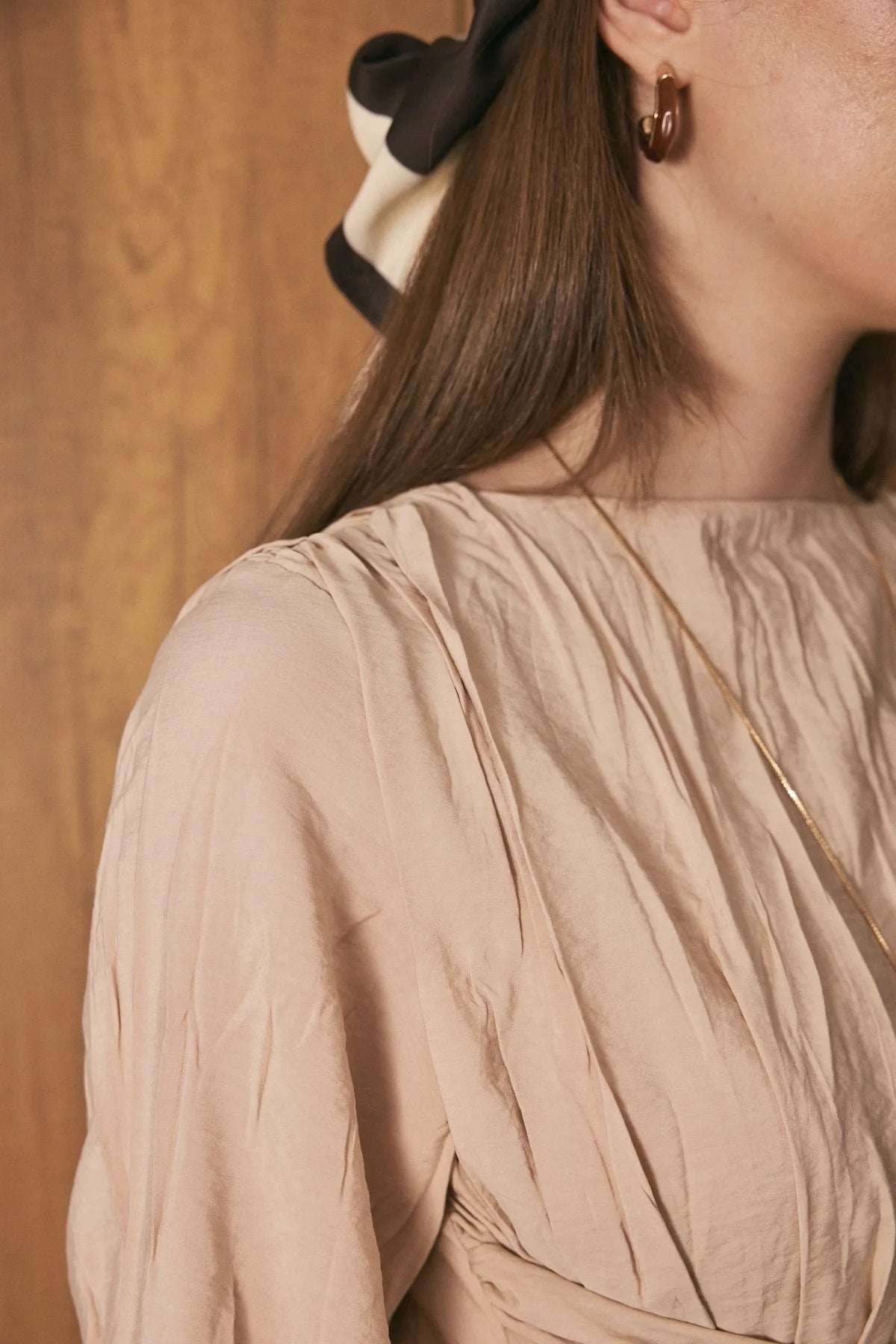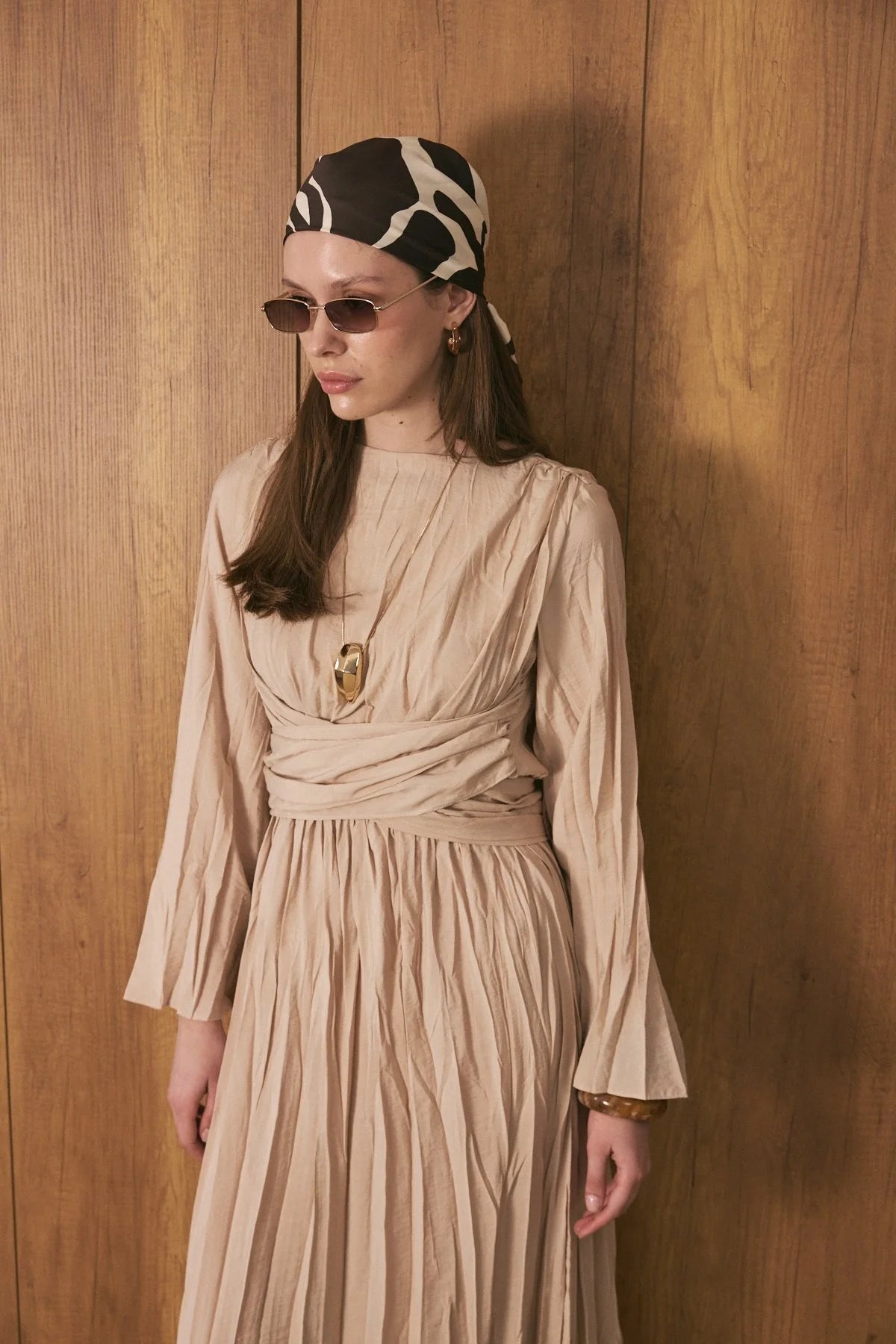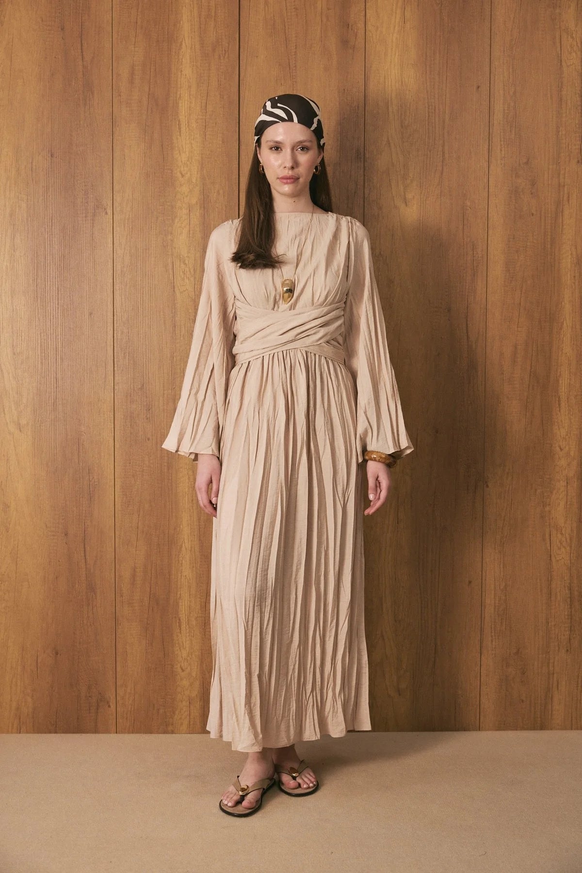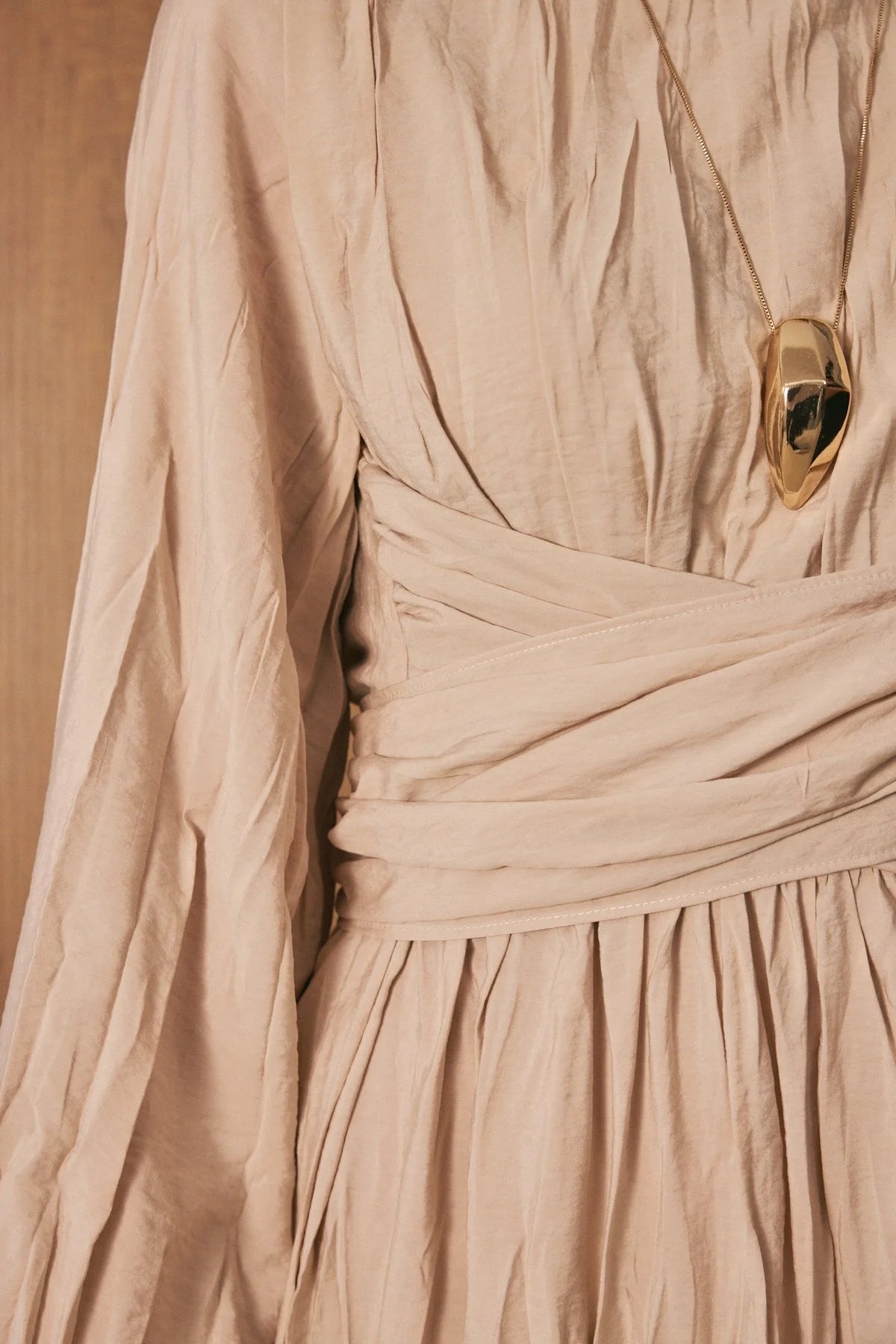Crinkle Effect Belt Detail Dress - Beige