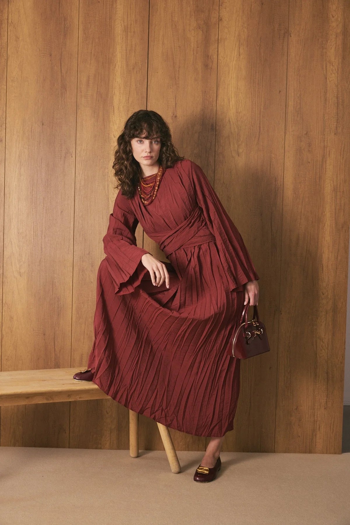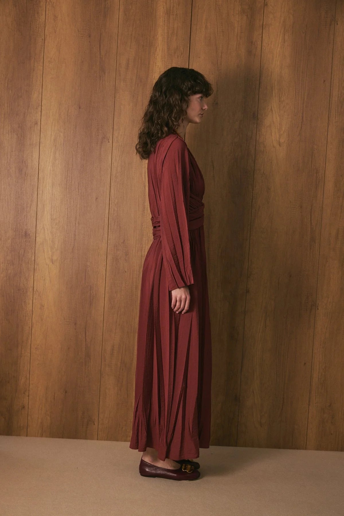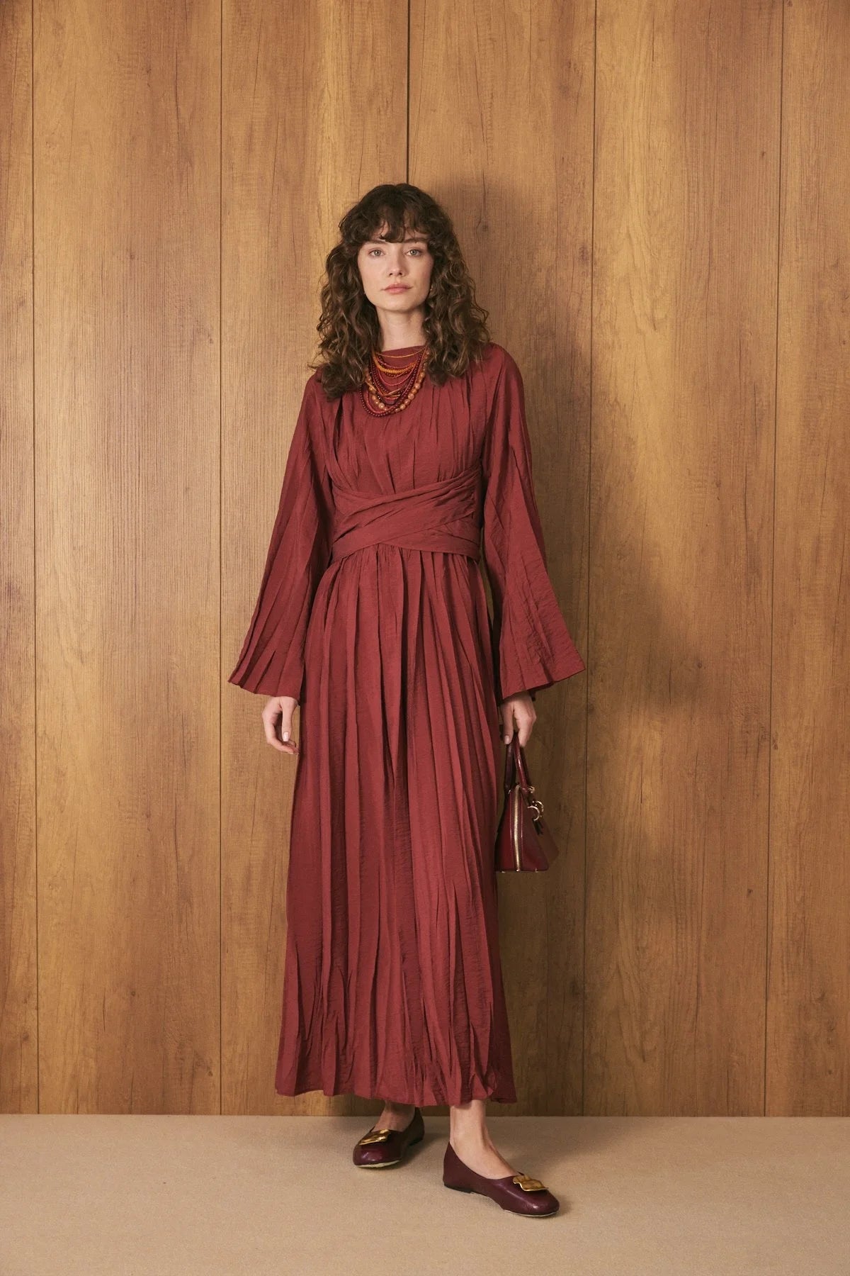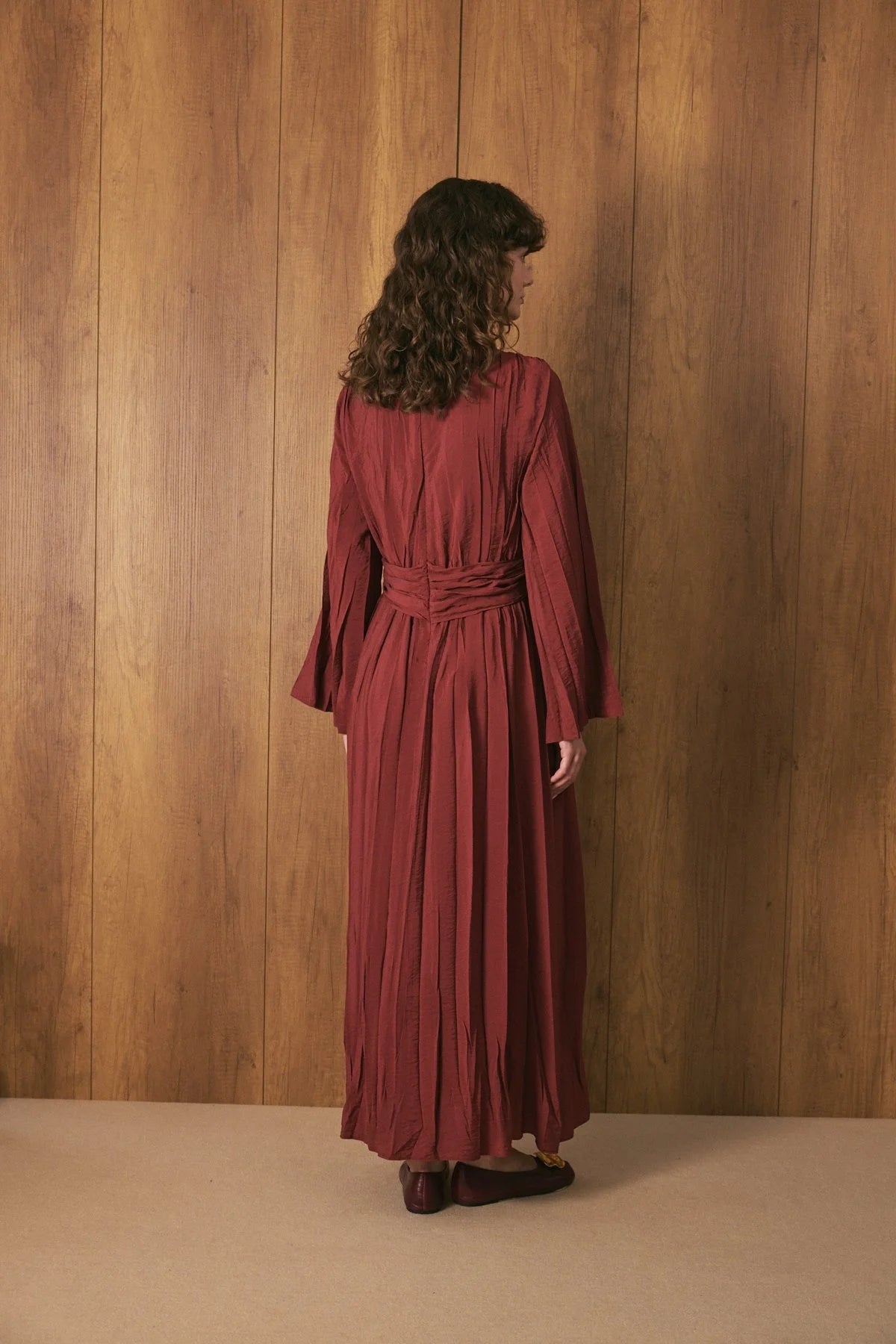 Crinkle Effect Belt Detail Dress - Burgundy