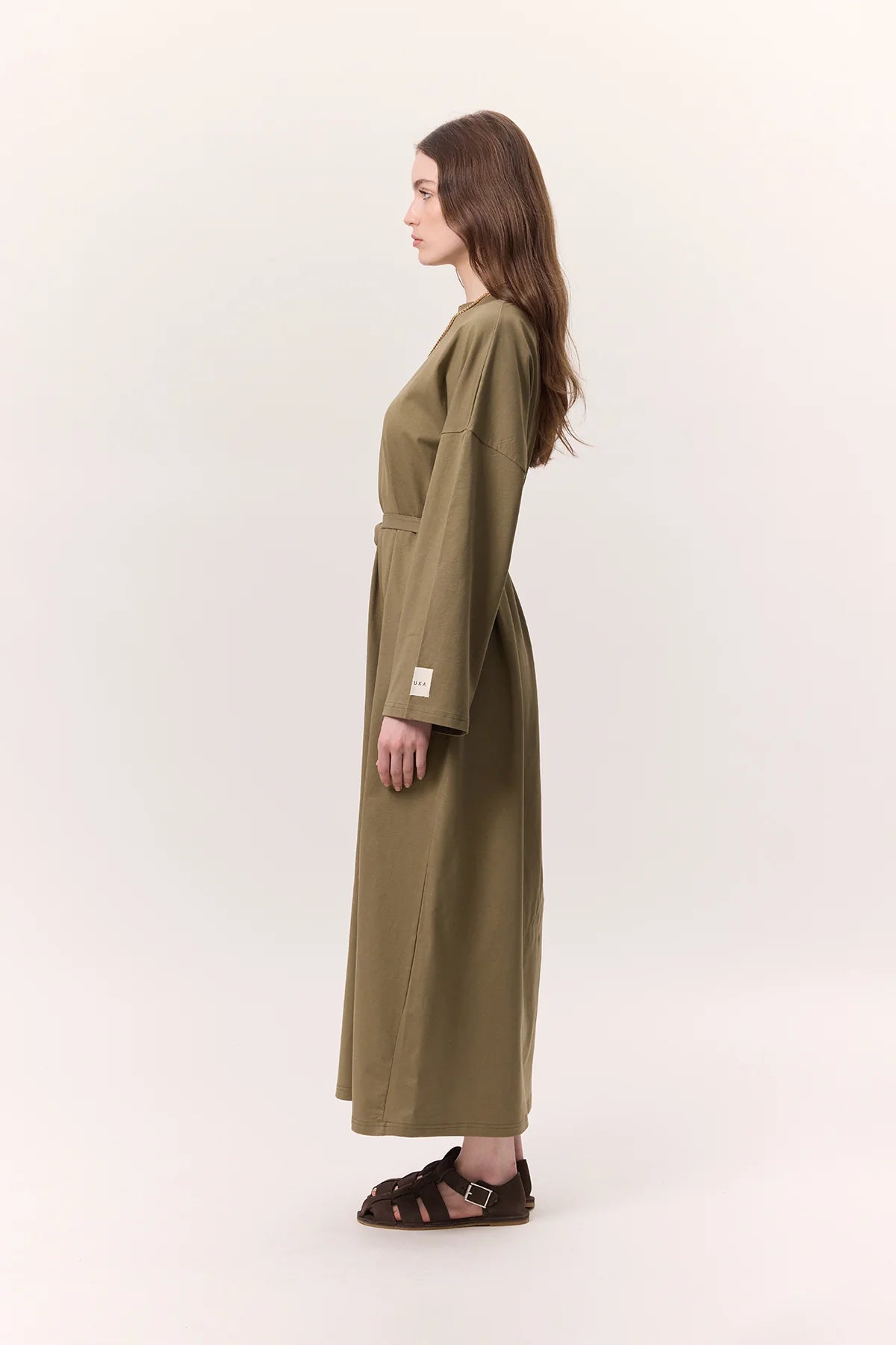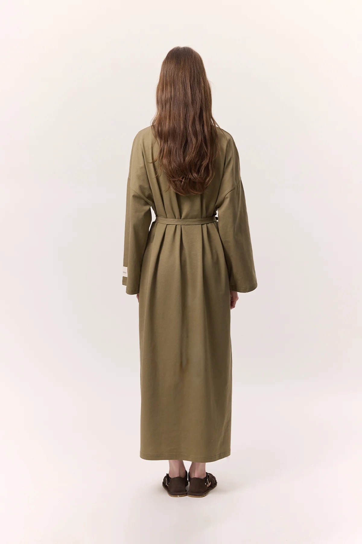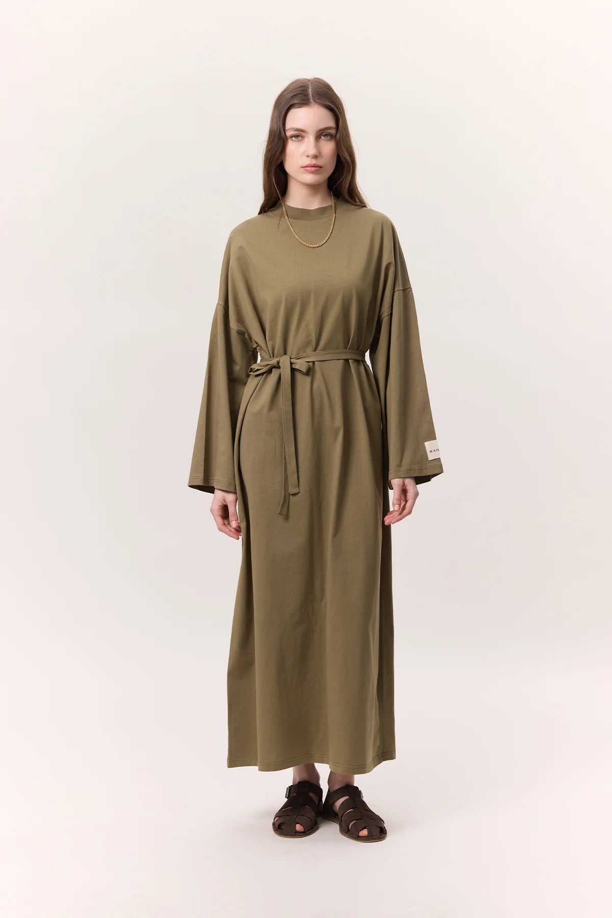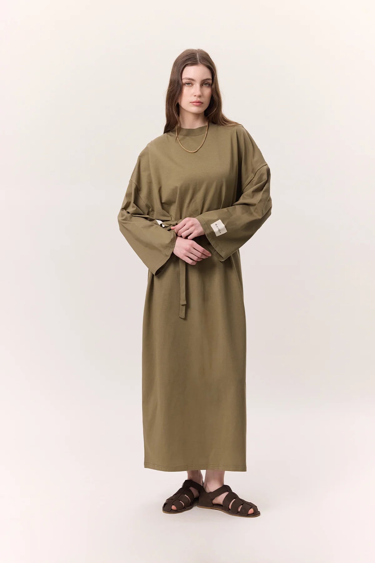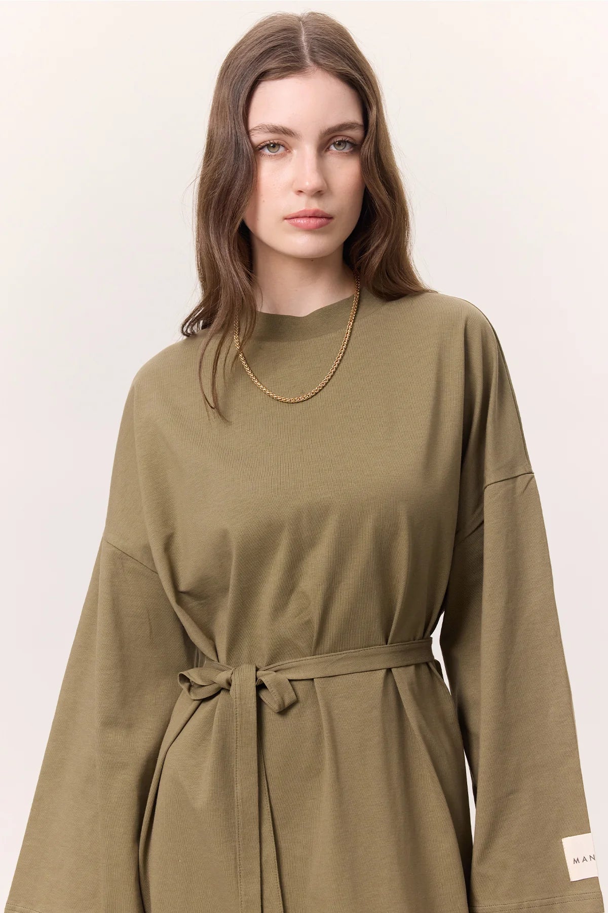 Round neckline. Drop shoulder. Wide sleeves. Belted