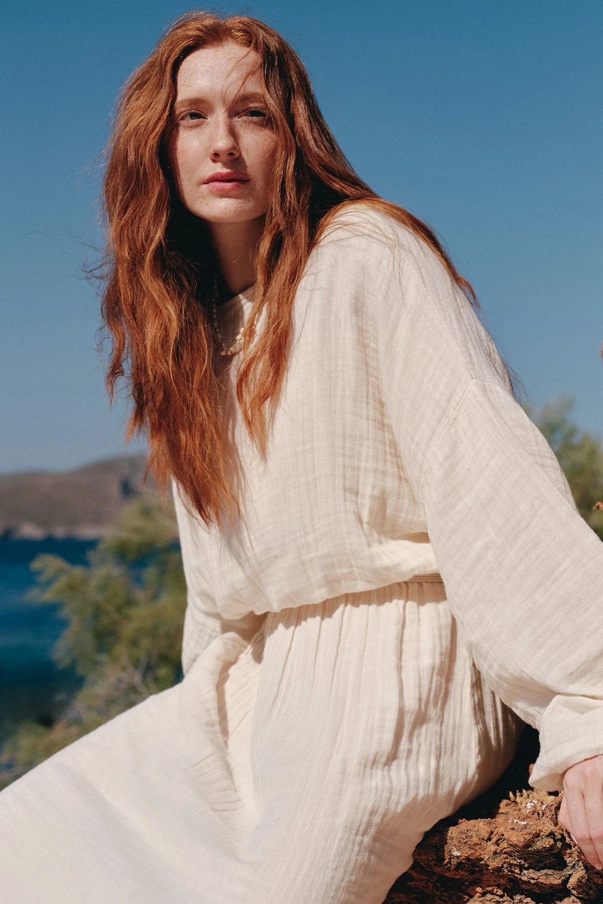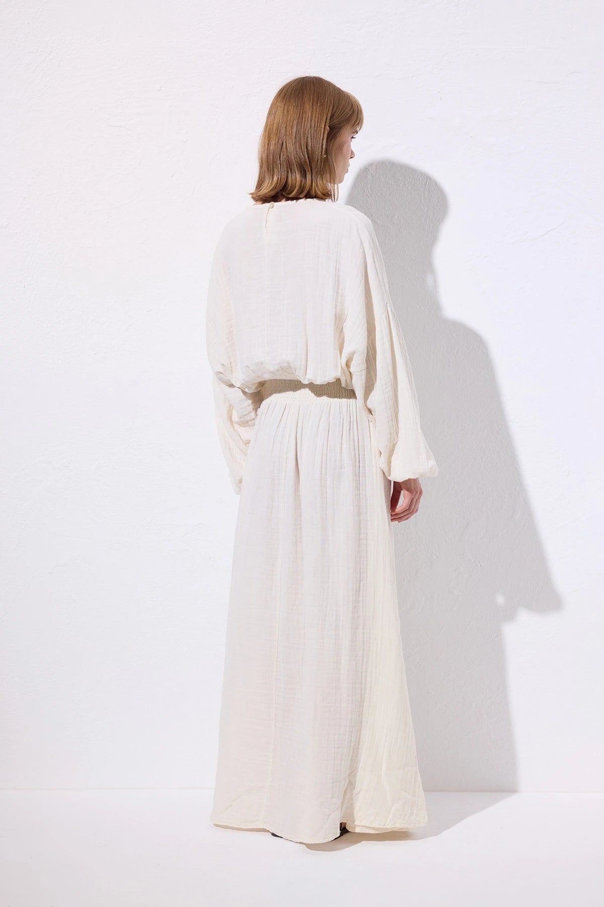 Effortless elegance meets everyday comfort. Crafted from 100% breathable cotton, this muslin dress features a flattering gathered waist, a softly draped bodice, and a timeless full-length silhouette — perfect for both casual days and elevated occasions.