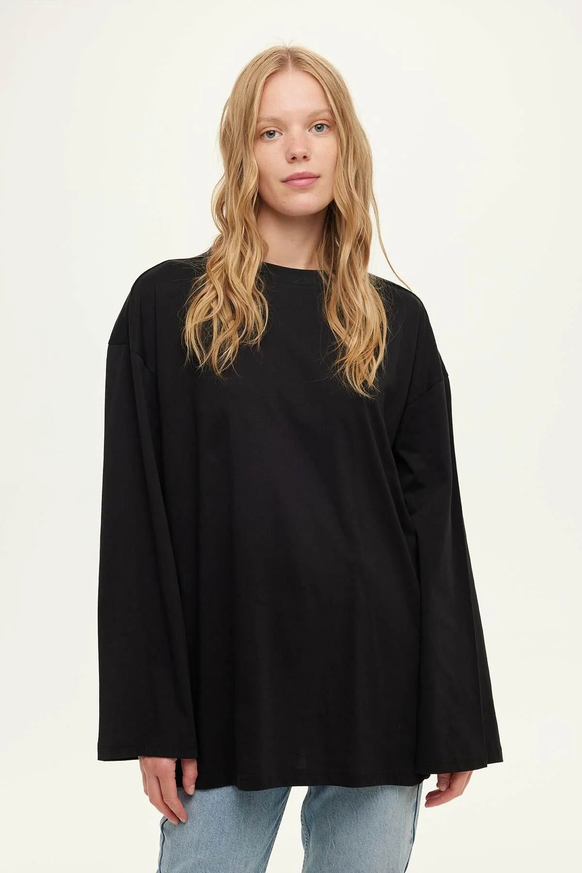 Crafted from soft cotton fabric, this T-shirt combines comfort with effortless style. With its high neckline and generous sleeves, it exudes a relaxed vibe while maintaining a chic silhouette. The oversized fit and tunic length offer versatility, allowing you to style it in a variety of ways. Whether you pair it with jeans for a casual day out or dress it up with trousers for a night on the town, this T-shirt is sure to become a staple in your wardrobe.