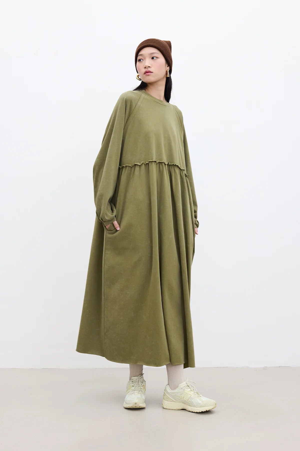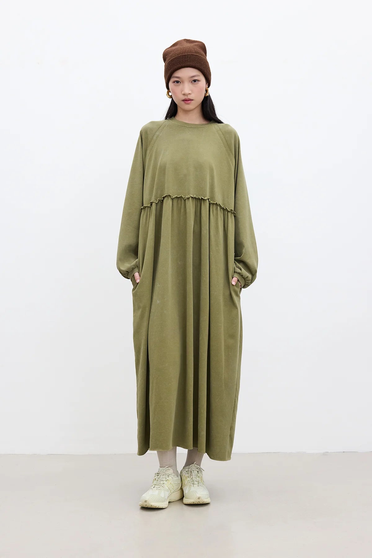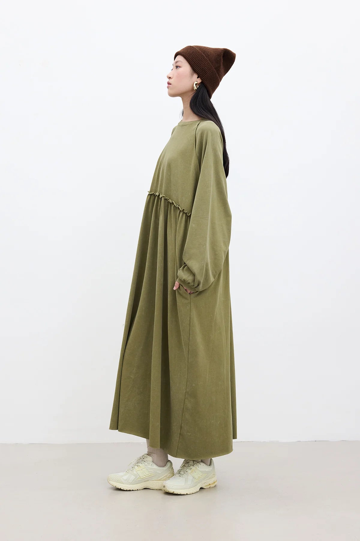 Relaxed and comfortable oversized dress crafted from soft fabric. Features a round neckline, long sleeves, and ruched detailing under the bust for a subtle shape. Designed with a loose, flowing silhouette for effortless wear. Perfect for casual days or layering with your favorite accessories. Includes side pockets for added practicality.