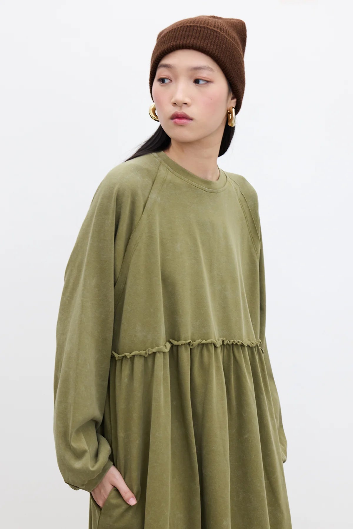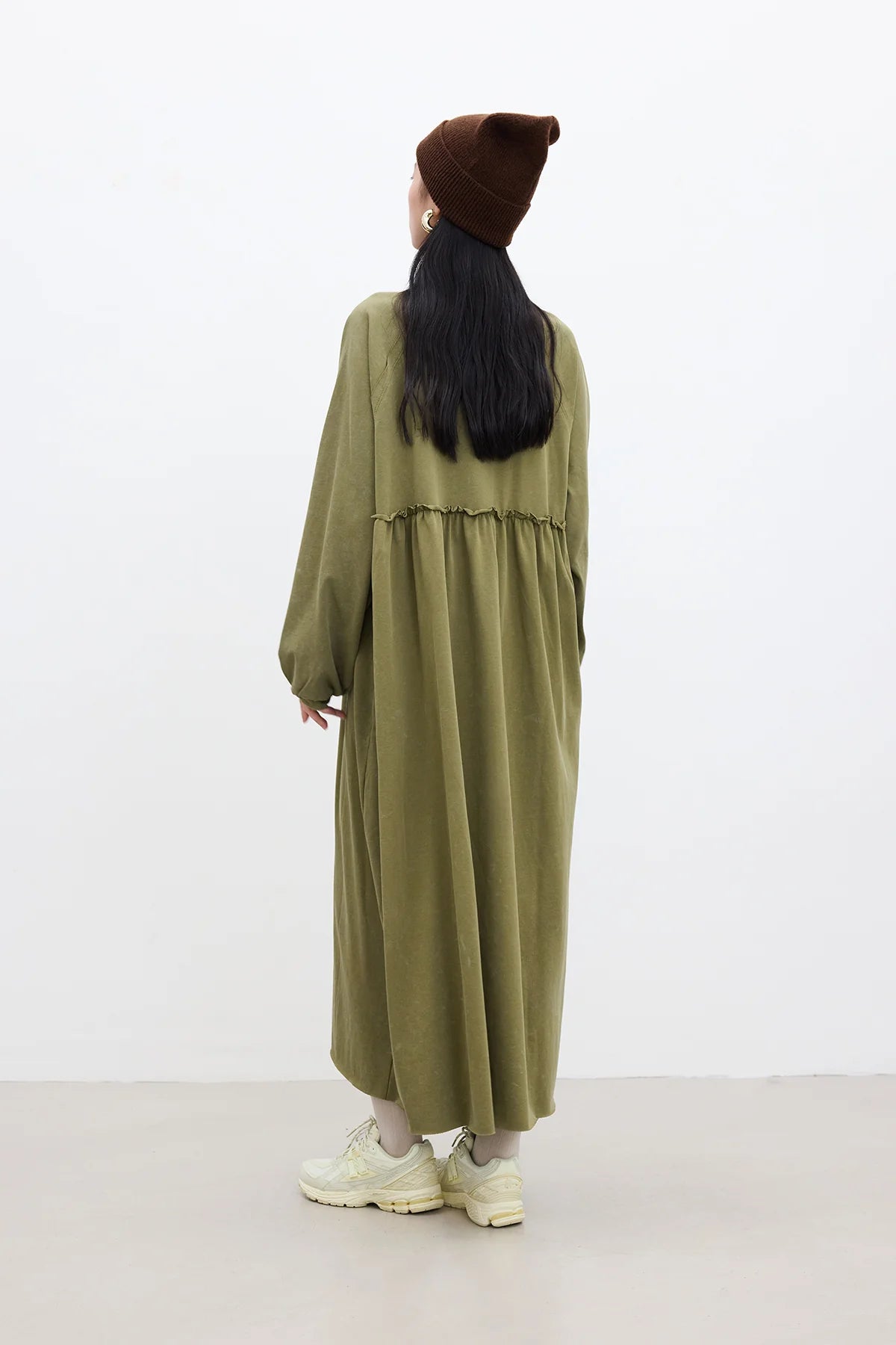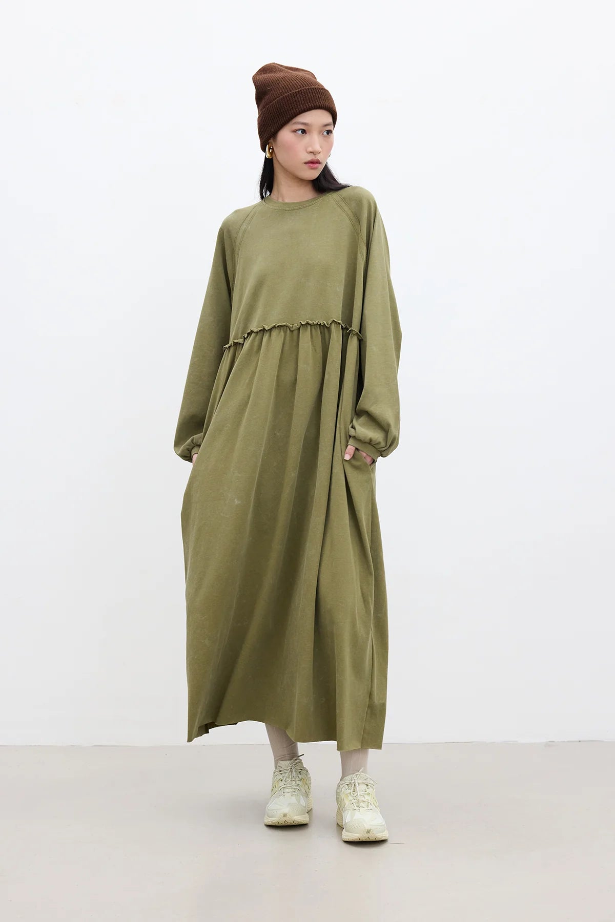 Relaxed and comfortable oversized dress crafted from soft fabric. Features a round neckline, long sleeves, and ruched detailing under the bust for a subtle shape. Designed with a loose, flowing silhouette for effortless wear. Perfect for casual days or layering with your favorite accessories. Includes side pockets for added practicality.