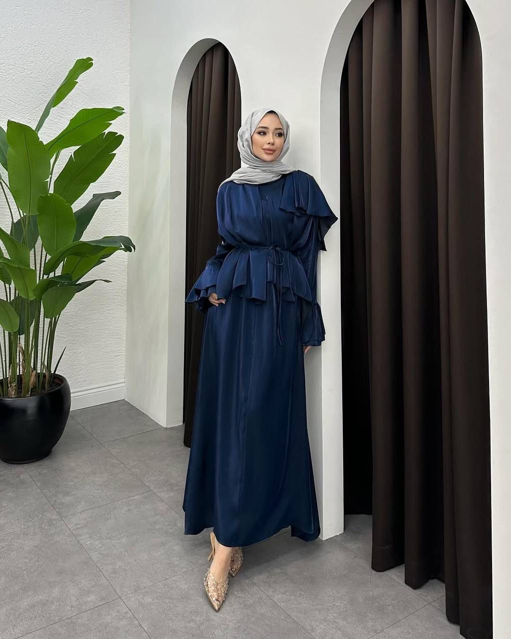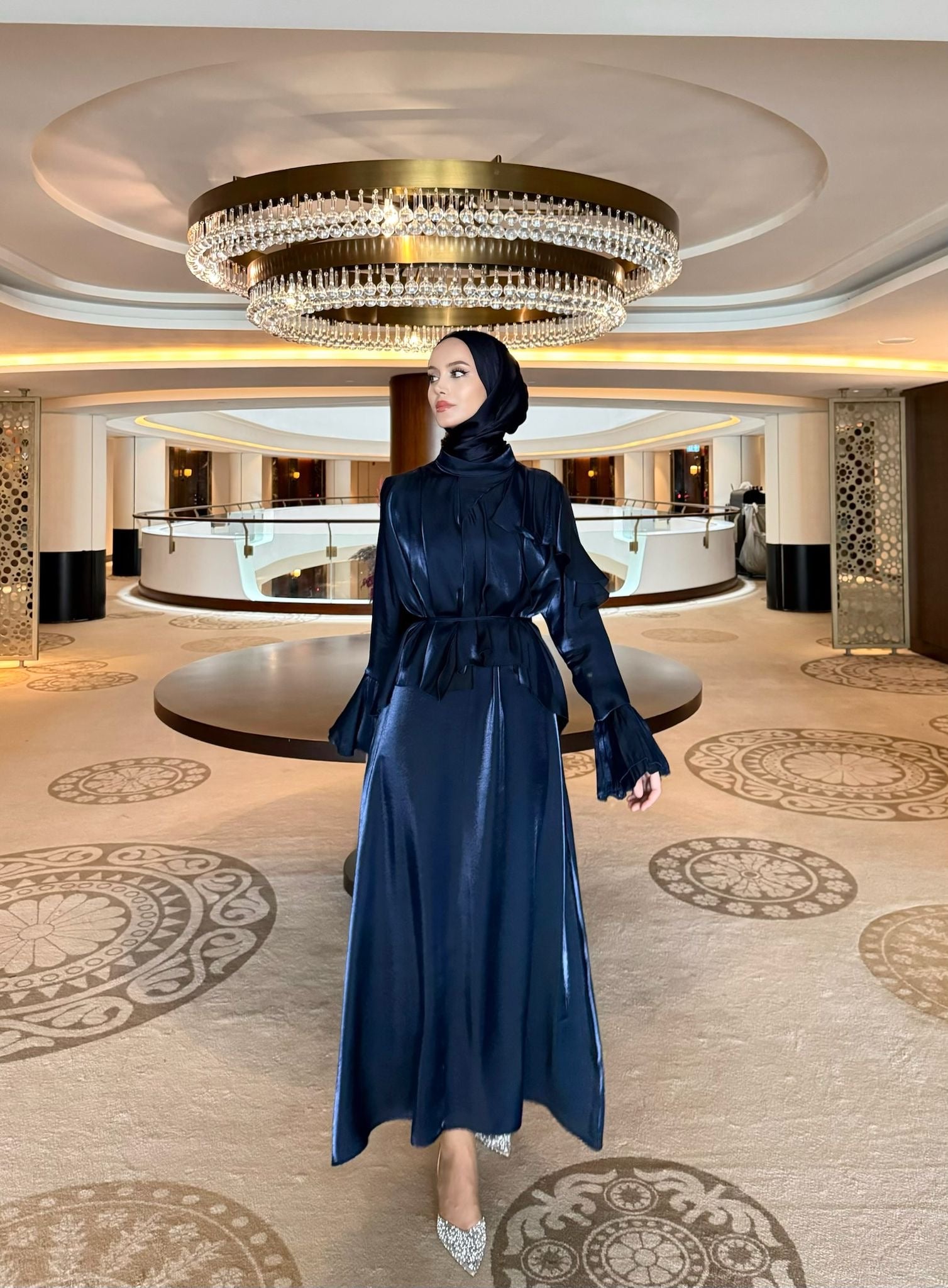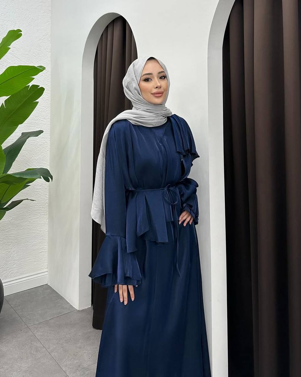 Elevate your wardrobe with this stunning navy maxi dress, crafted from a silky, lightweight polyester fabric that offers a luxurious drape and subtle sheen. Designed with modesty and elegance in mind, it features a flattering tie waist and statement flared sleeves with layered cuffs. Ideal for formal occasions, evenings out, or Eid celebrations, this dress brings effortless sophistication to any special moment.