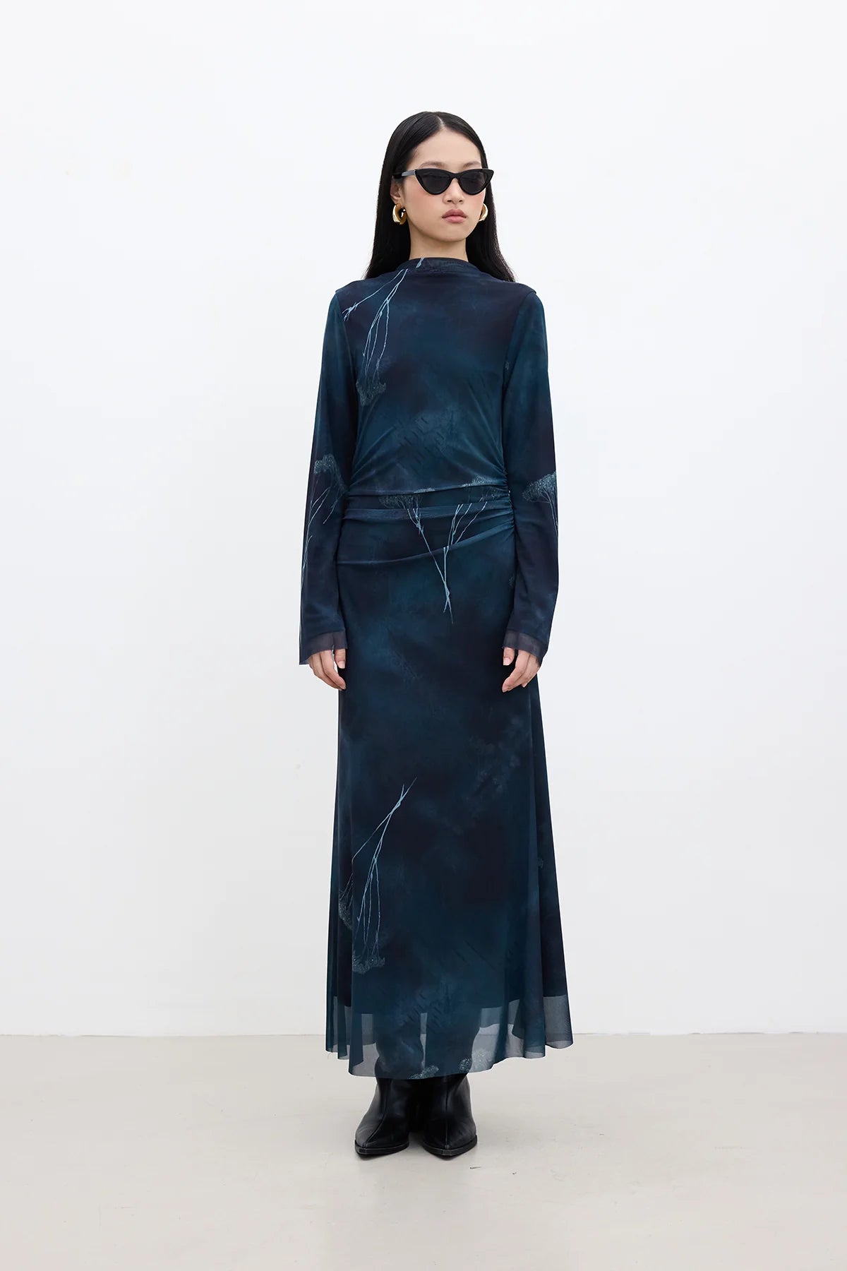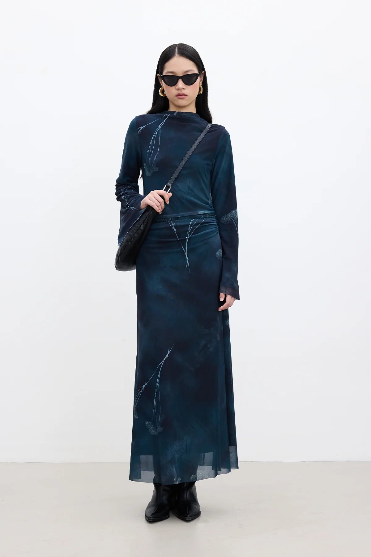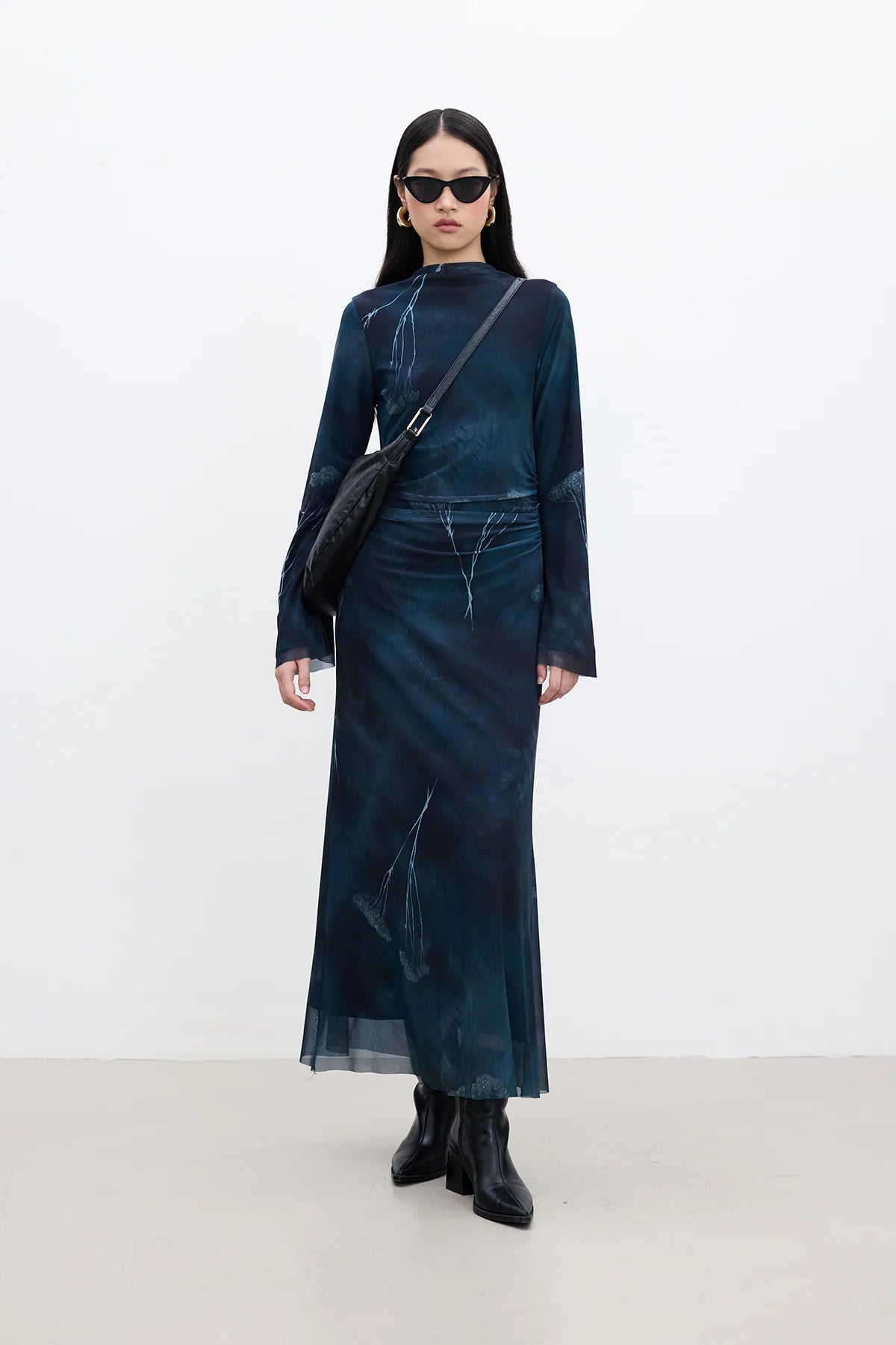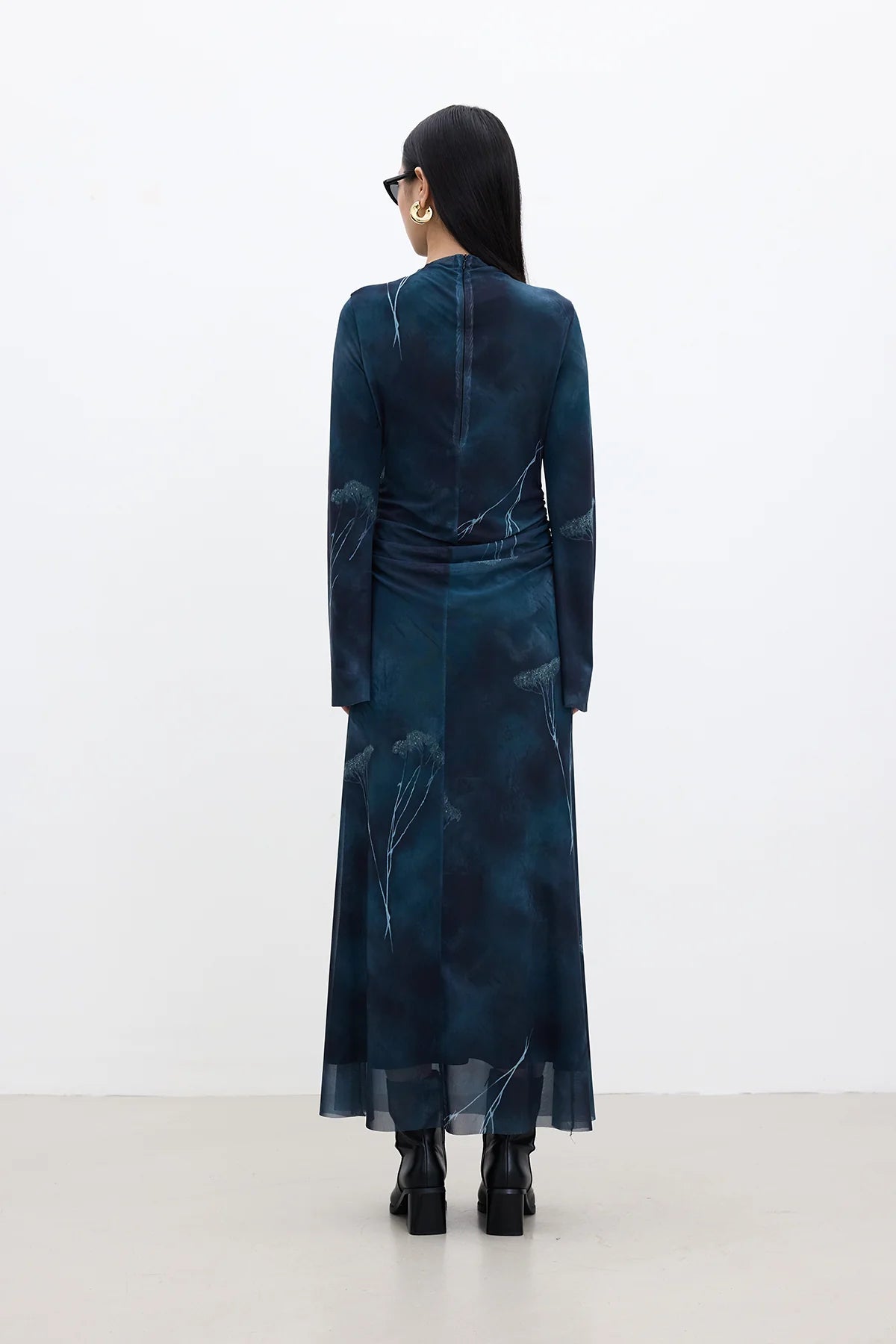 Patterned Wide-Sleeve Tulle Dress Dark Green