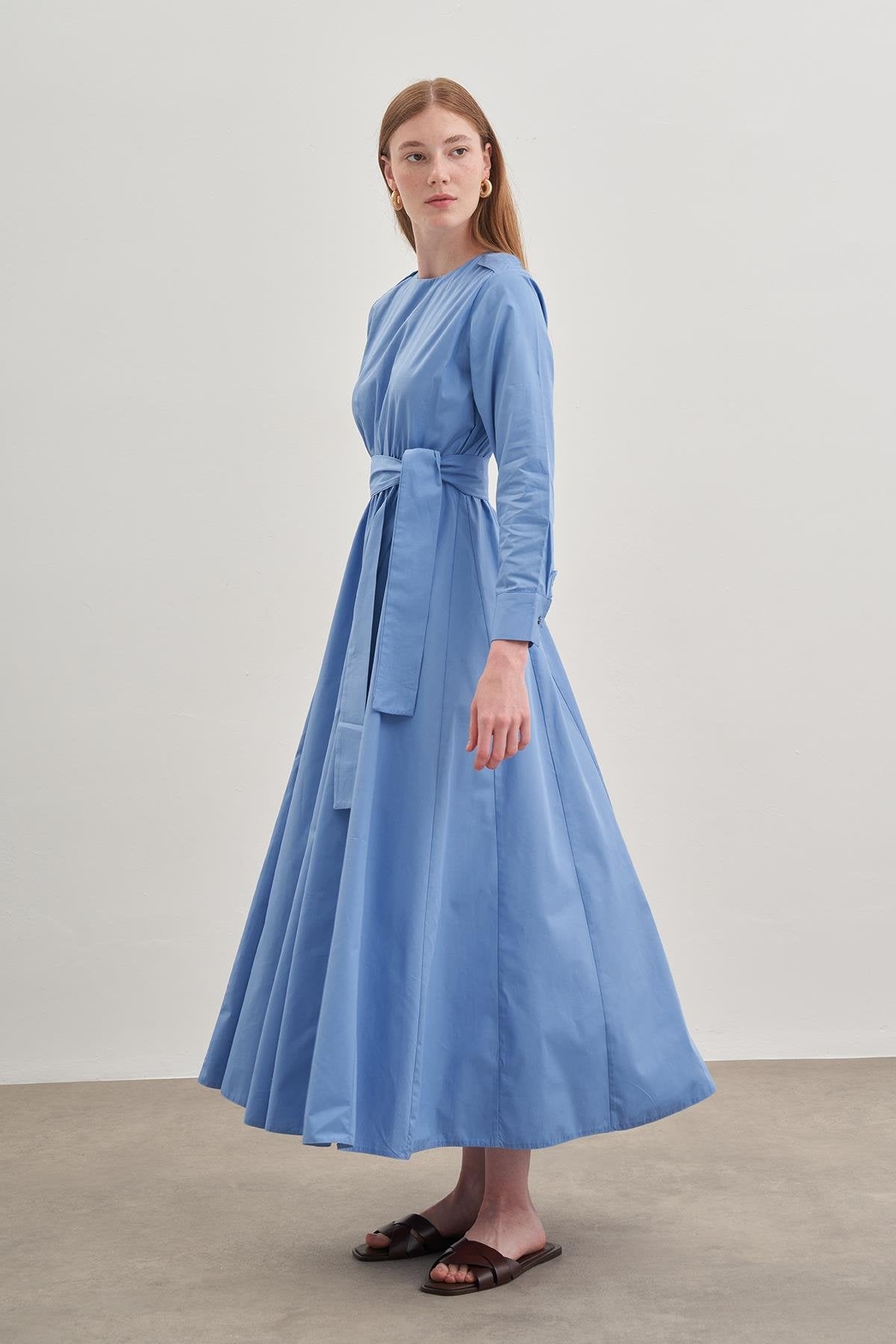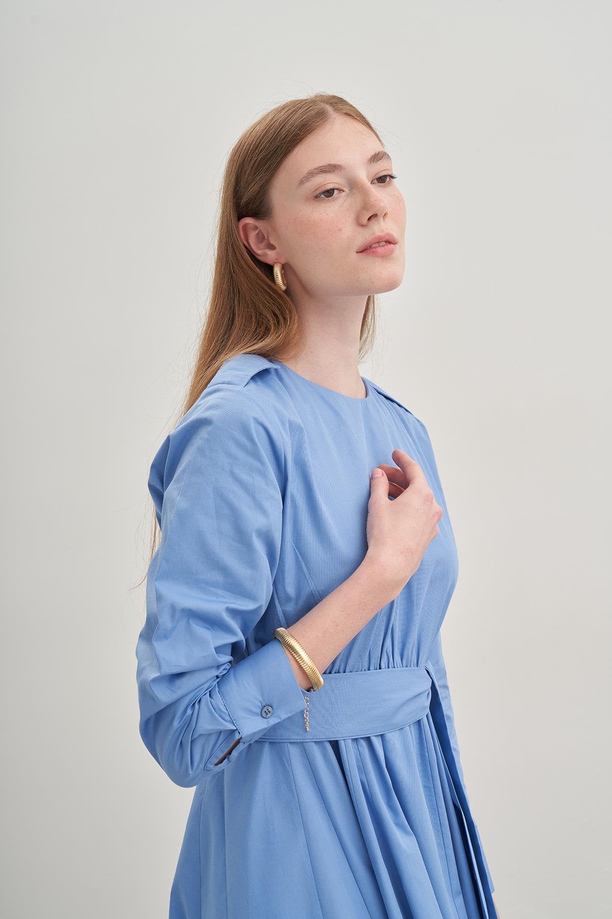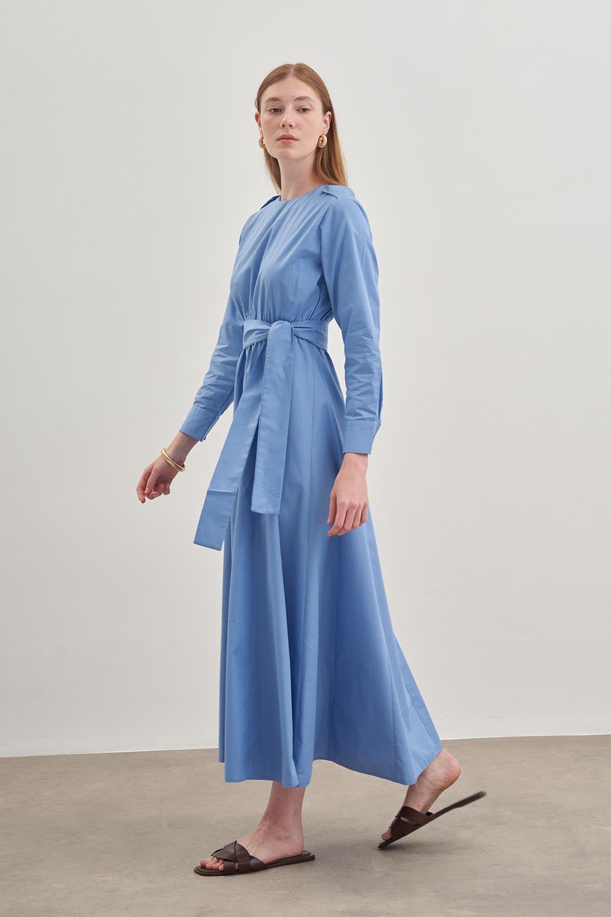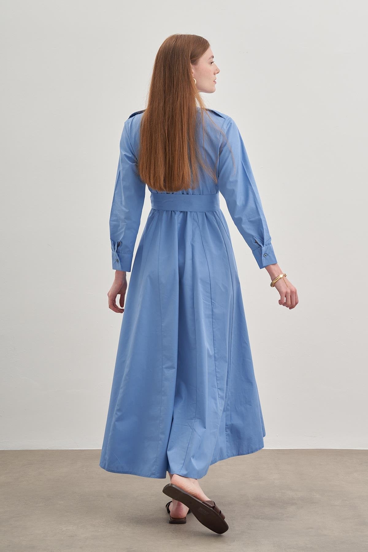 Elegant dress is made from 100% cotton poplin fabric, featuring chic epaulette details, cuffed sleeves, and a zipper closure at the back. The skirt is designed with a panelled cut for a flattering fit. The dress also includes a detachable belt for an adjustable silhouette.